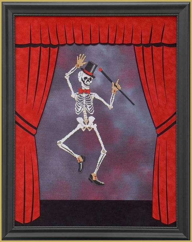 Mr Bone Jangles... Counted Cross Stitch CHART by Glendon Place. Finished Size: 9"x 14.75" (23 x 37.5cm) Cross Stitched on a most beautiful fabric!... An old saying' Got a Skeleton in the Closet? This skeleton really takes the cake, it has a stage presence all it's own, and an old soft shoe as he taps out a tune in his top hat, fancy shoes and cane. The red curtain surrounding the design is not part of the design, but rather a cleverly designed matt. Looks Fabulous. Stitched on 28 count Red Wing linen hand-dyed by Crossed Wing Collection. Stitch Area: 130w X 210h.Stitch Count: 126w X 208h