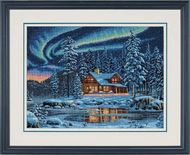 Northern Lights... GOLD COLLECTION in Counted Cross stitch by Dimensions. Size: 11"x 16" (28 x 41cm) This counted cross stitch design features an incredible to-see display in a spectacular sky while camping by the lakeside! Northern Night in counted cross stitch is another stunning design by Designer Abraham Hunter. © Abraham Hunter / Hadley House Company (2014).