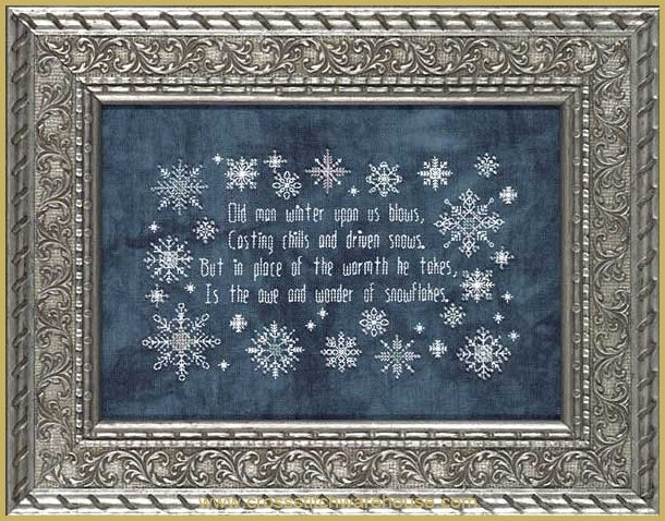 Ode To Snowflakes... Cross Stitch CHART by Glendon Place. Finished Size: 8.75"x 5.5" (22.2 x 14cm) Brrr! Fluffy – Frosty – Falling – Flakes of Snow! Snowflakes are a phenomenon that amazes us all. Simply put, snowflakes are nature’s art. The complex, beauty, symmetrical structure of a snow crystal quite literally arises out of thin air as it tumbles through the clouds. Real snow crystals are hexagons with a six-faceted symmetry. However, for the ease of designing and stitching, these beautiful snowflakes are eight-sided. They include pale metallic braid for shimmer and pastel crystal beads to add a touch of dimension and iridescence.
