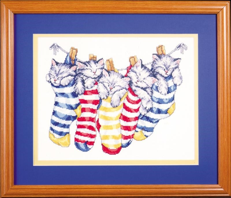 On The Line Kitty's... Large Counted Cross Stitch Kit by Design Works. Size: 12"x 14" (30.5cm x 35.5cm) Another cute collection of adorable kitties feature in this cross stitch design, all hangin' out to dry in bed socks pined up in the spring breeze. a must for cat lovers. There so loveable! A cross stitch the family will love with a comical theme. For more loveable kitties, LOOK under CATS on our Site.