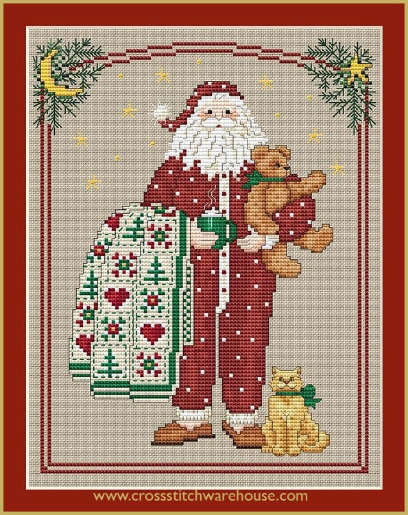 Pajama Santa... Cross Stitch CHART by Sue Hillis Designs. Size: 8"x 10" (20 x 25.4cm) This Santa is number nine in our annual series and is a perfect compliment to the other Santas in the collection. This Santa shows he is ready for that long well-deserved winter nap! He's got his quilt, his teddy, and his kitty cat... When stitched on 28 count fabric "over two threads" cross stitch will fit perfectly into a standard 8"x 10" frame. If you desire Aida. Granny May Suggests either Lite Khaki or Parchment achieve the same look... Our model was stitched with Sullivans 100% Egyptian Cotton Embroidery floss on 28ct. Lugana "Summer Khaki" from Zweigart.