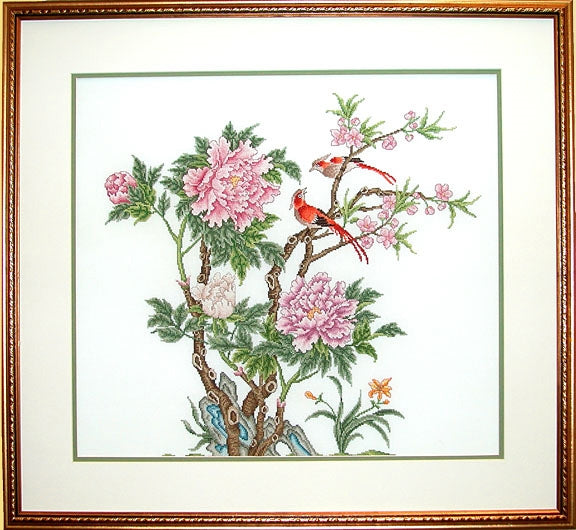 Peony Tree Complete... Designed by Carolyn Meacham. Size: 20"x 21.25" (51 x 54cm) Counted Cross Stitch Kit by Serendipity Designs. Peony Tree is a wonderful addition to the collection. An Oriental centerpiece in still life. A Peony Floral Fantasy from an earlier period, set in a gorgeous floral arrangement. It is artfully detailed and shaded, but it is a completely new design from Carolyn Meacham Collection. Just Superb.