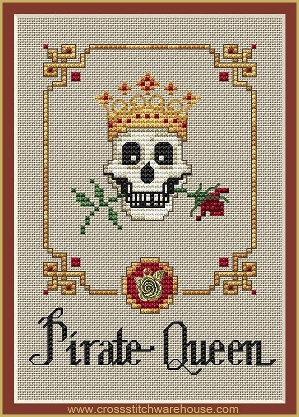 Pirate Queen... Cross Stitch CHART by Sue Hillis Designs. Size: 3.8"x 5.7" (9.6 x 14.5cm) Cross Stitch Size is: 53 x 71 stitches. Argh! Meet our collection Pirates! Who says the leader of the pack has to be a king? What a joke. The head of this ship is a pirate Queen, complete with red rose gripped in a toothsome grin to show the world her rough tough feminine side. A pirate queen always accessorizes with her treasures, so the design includes a detailed gold-toned rose charm. When cross stitched on 14ct. Lite Khaki, Parchment or, Beige, for 28ct. "over two threads" use a Matching Linen or Evenweave, this design fits perfectly into a standard 5"x 7" Frame.