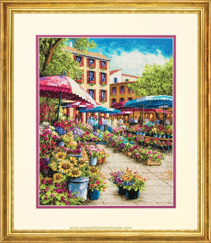 Provence Market... Counted Cross Stitch Kit by Dimensions. Size: 12"x 15" (30.5 x 38 cm). Summer is a special time of the year shown here in this delightful Mediterranean cross-stitch of the flower markets in Provence. Provence Market from The Gold Collection depicts the flower sellers' stalls in the sunny south of France. An abundance of fresh-cut blooms is captured in this design. Designed by Sam Park. © Sam Park / SOHO Editions / Art licensing.com.