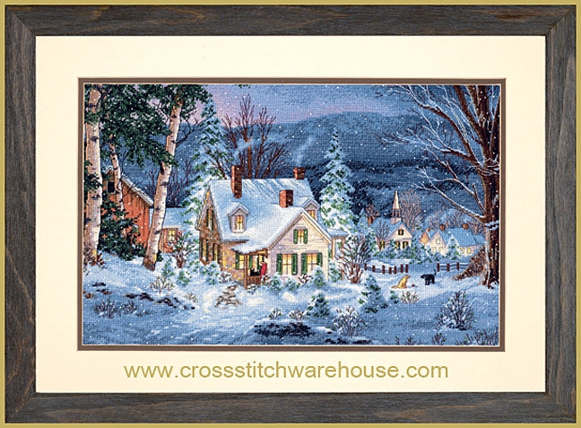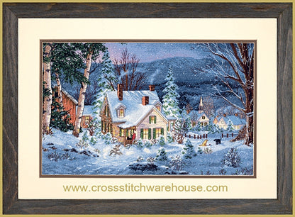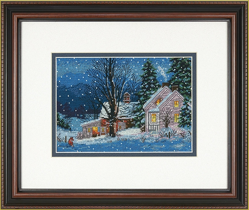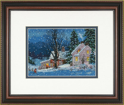 Quiet Night... GOLD PETITE Counted Cross Stitch Kit. Size: 5"x 7" (13 x 17 cm). You're going to love this stitched result. This is the most highly detailed design! Quiet Night in counted cross stitch is a lovely scene that can be displayed all winter long. This design from The Gold Collection Petites uses the half cross stitch for subtle shading. Designed by Fred Swan. © Fred Swan / Champlain Collection.