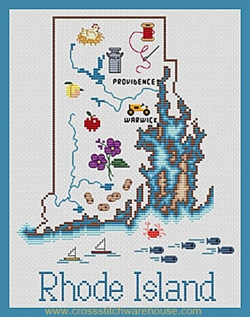 Rhode Island... Cross Stitch Chart by Sue Hillis Designs. Finished Size: 6.9"x 9" (17.5 x 23cm) Cross Stitch Size In Stitches is: 96 by 126. Cross stitch state maps include symbols for the major state industries and the state capital.