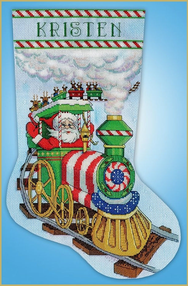 Santa's Train Stocking... Counted Cross Stitch Stocking by Design Works. Size: 17" (43cm) Long. A colorful Christmas novelty cross stitch stocking that you will want to fill to the top, showing Santa's Train all loaded up with goodies ready for that busy night. The children will love it.