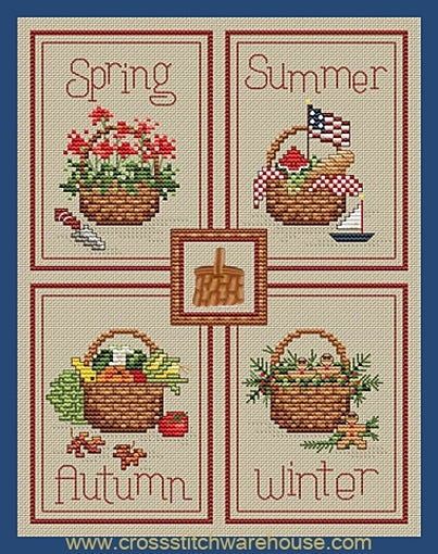 Seasons Baskets... Cross Stitch CHART by Sue Hillis Designs. Finished Size: 6.5"x 8.5" (16.5 x 21.6cm) This cross stitch is: 91 x 119 Stitches. A sampler of baskets to celebrate each season! When stitched on 14ct. Parchment/Beige Aida. or "over two threads" on 28ct, matching color Linen or Evenweave, this project will fit perfectly into an 8"x 10" Frame.