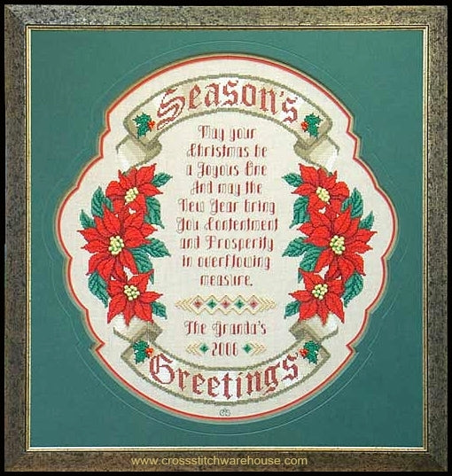 Seasons Greetings Sampler... Cross Stitch CHART by Glendon Place. Finished Size: 15.25"x 16.75" (38.7 x 42.5cm) Welcome all your friends and visitors into you home during the holiday season with this splendid festive "Season’s Greetings sampler. Stitched in bright Christmas colors of red and green and accented with metallic thread and beads. The center of the sampler contains this heart-felt holiday wish: May your Christmas be a joyous one and may the New Year bring you contentment and prosperity in overflowing measure". A complete alphabet in upper and lower case is provided so that you can personalize your sampler.