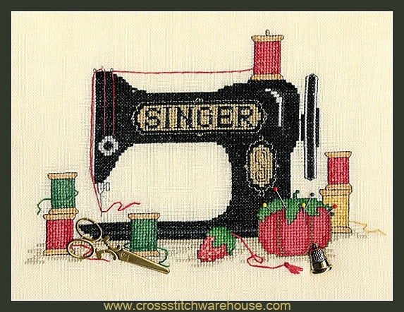 So Many Memories... Cross Stitch CHART by Sue Hillis... Size: 8.8"x 7.1" (22.3 x 18cm) Cross Stitch Size in Stitches: 119 by 85. Memories; We all remember watching grandma at her old Singer sewing machine when we were children? Cross Stitch this nostalgic design and embellish it with the special antique gold-toned scissors and thimble that Grandma would never let us play with! One of the very best sellers in sewing designs, it's also great for quilters and seamstresses too! When cross-stitched on 14ct. Antique White ~ Ivory ~ Natural Aida, or "over two threads" on matching color 28ct. Linen ~ Evenweave, this design will fit perfectly into an 8"x 10" Frame.