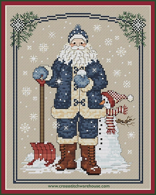 Snowflake Santa... Cross Stitch CHART by Sue Hillis Designs. Size: 8"x 10" (20 x 25.4cm)  Welcome to our seventh Santa in the Series of the Annual Santa collection. Santa is shown here wearing a beautiful blue coat and pants. He holds his shovel as he once again clears away the snowflakes that are being to fall from the winter sky. Hiding behind Santa is a sweet little snowman in his cheery red and white hat and scarf. Like all our other Annual Santas there sure to brighten any Christmas De...... When stitched on 28ct. Fabric "over two threads" finished cross stitch will fit perfectly into a standard 8"x 10" frame. If you desire Aida.  Granny May Suggests either 14ct. Lite Khaki or Parchment to achieve the same look... Our model was stitched with Sullivans 100% Egyptian Cotton Embroidery floss on 28 count Lugana "Summer Khaki" from Zweigart.