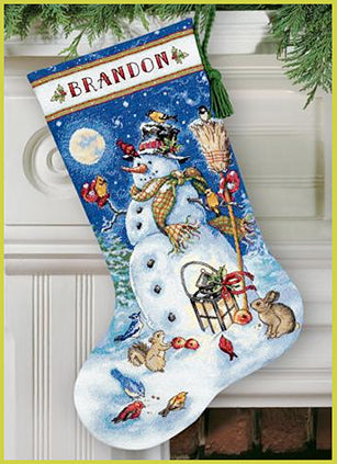 Snowman & Friends Stocking... 16" (41cm) A beautiful serene woodland scene creatures a winter wonderland depicting birds drawn to a handsome snowman in this Dimensions counted cross stitch Snowman & Friends Stocking. Perfect for boys or girls of all ages. Size: 16" Long. Designed by Donna Race. © Donna Race.