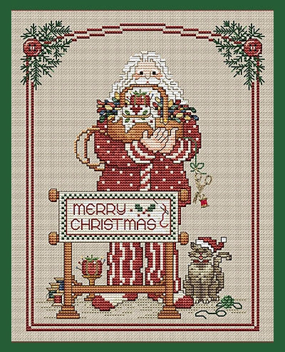 Stitching Santa... Cross Stitch CHART by Sue Hillis Designs. Design Size: 6.75"x 7.25" (17.2 x 18.4cm) Finished Frame Size: 8"x 10" (20 x 25.4cm) Stitching Santa, is another in the Annual Santa collection series! Thank you, Santa! Design when stitched on 28 count fabric "over two threads" will fit perfectly into a standard 8"x 10" frame. If you desire 14ct. Aida. Granny May Suggests either Lite Khaki or Parchment achieve the same look... Our model was stitched with Sullivans 100% Egyptian Cotton Embroidery floss on 28ct. Lugana "Summer Khaki" from Zweigart.