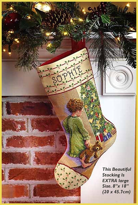 Christmas Morning Stocking... Counted Cross Stitch Kit, Made in the USA by Janlynn. Size: 8"x 18" (20 x 40.6cm). This is a large beautiful bright Stocking to fill with goodies. You can sleep with one eye open, or sneak a peek, it doesn't matter, you'll have trouble filling this stocking. Counted Cross Stitch Design is by Diana Thomas...