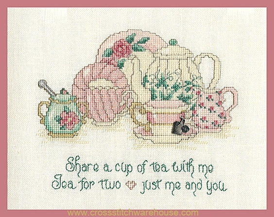 Tea For Two... Cross Stitch CHART by Sue Hillis Designs. Finished Size: 7.3"x 6" (18.5 x 15.2cm) This cross stitch is: 103 x 84 Stitches. Tea for two or two for tea, invites you and your friends to share a cup of tea! This cross stitch is a lovely addition for your kitchen or dining room, or stitch it for a special friend. When stitched on 14ct. Aida. Antique White/Ivory or "over two threads" on 28ct matching color Linen/evenweave this project will fit perfectly into a standard 8"x 10" Frame.