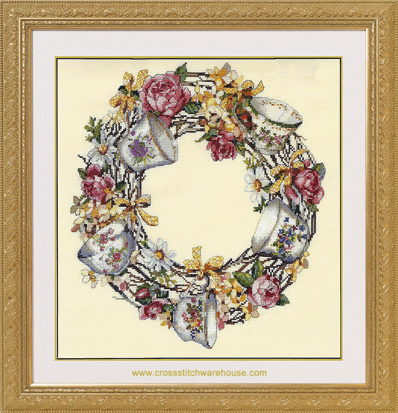 Teacup Wreath... 15"x 15" (38 x 38cm) Cross-Stitch Pillow or Picture kit. This design is a delightful cross stitch design with its colorful collection of Wedgewood & Daulton teacups. The design would also suite a pillow with its suitable 15"x 15" size.
