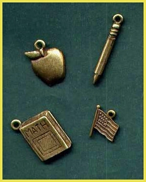 Stock Item: #CH-L142 Antique Collection of Gold Toned Charms, An Apple, a Book, an American Flag and a Pencil.
