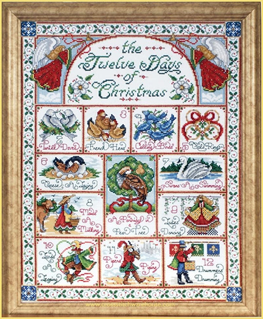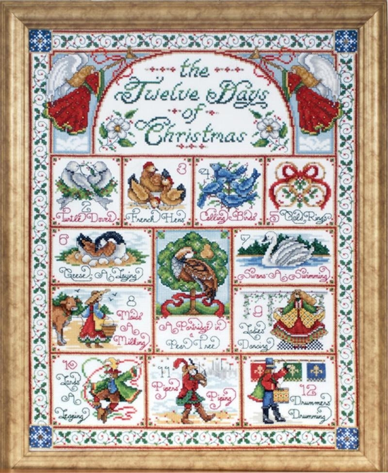 Twelve Days of Christmas... Counted Cross Stitch Kit by Design Works. Size: 14"x 18" (35.5 x 45.7cm) A delightful Christmas Holiday cross stitch design featuring an inspirational poster-style format depicting the Twelve Days of Christmas. Cross Stitch features lovely Christmas color tones. I consider this design a collector's piece.