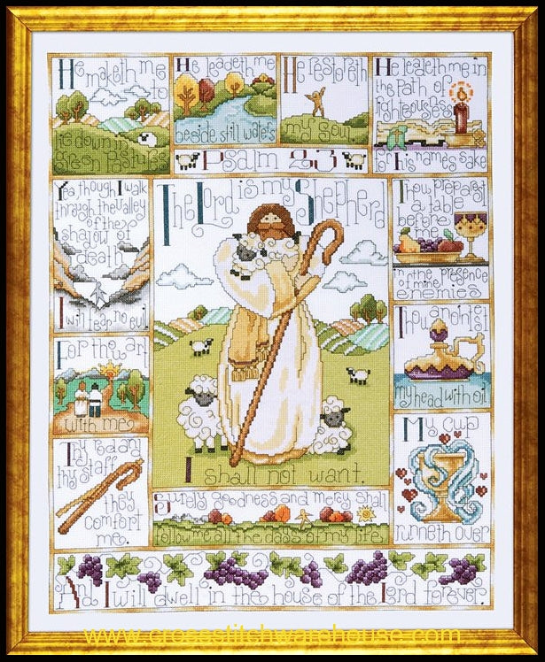 Twenty-Third Psalm... Counted Cross Stitch Kit by Design Works. Size: 16"x 20" (40.6 x 51cm) A delightful cross stitch design featuring an inspirational poster style format depicting biblical events from the Holy Land. Cross Stitch features lovely soft color tones—a religious collector's piece.