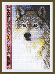 Wolf... MINI Counted Cross Stitch Kit, Made in the USA by Janlynn. Size: 5"x 7" (13 x 18cm) Wolve portrait, a commanding image of this mighty hunter, with a native American band which highlights this design by Roger W. Reinardy.